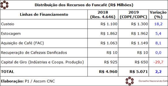 Em reunião realizada na quinta-feira, 11 de abril, o Conselho Nacional do Café (CNC) e os demais membros do Conselho Deliberativo da Política do Café (CDPC) aprovaram orçamento recorde de R$ 5,071 bilhões do Fundo de Defesa da Economia Cafeeira (Funcafé) para a safra 2019.Esses recursos representam uma evolução de 2,2% na comparação com 2018, quando a atividade contou com R$ 4,960 bilhões.