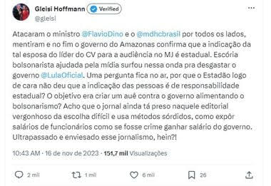 O que disse o PT? – A distorção foi divulgada pela presidente nacional do PT, a deputada federal Gleisi Hoffmann (PT-PR), em um post no X (antigo Twitter) nesta quinta-feira (16). “Atacaram o ministro Flávio Dino e o Ministério dos Direitos Humanos por todos os lados, mentiram e no fim o governo do Amazonas confirma que a indicação da tal esposa do líder do CV para a audiência no MJ é estadual (...)”.