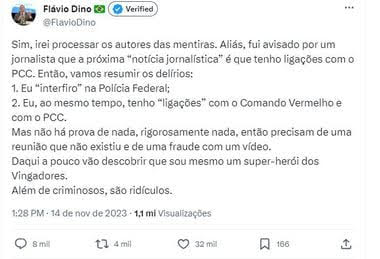 O que disse o ministro – Na terça-feira (14), depois da divulgação das primeiras reportagens sobre o caso, o ministro Flávio Dino disse em postagem no X (antigo Twitter) que foi “avisado por um jornalista que a próxima ‘notícia jornalística’ é que tenho ligações com o PCC”, referindo-se ao Primeiro Comando da Capital, a principal facção criminosa brasileira, de origem paulista. “Eu, ao mesmo tempo, tenho ‘ligações’ com o Comando Vermelho e com o PCC”, escreveu ele