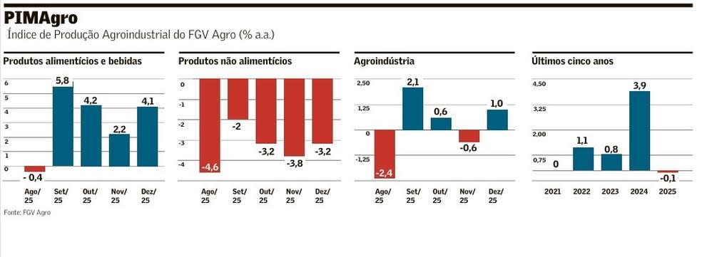 A produção da agroindústria brasileira encerrou 2025 praticamente no zero a zero. No cabo de guerra entre juros altos de um lado e, do outro, o mercado interno aquecido, o Índice de Produção Agroindustrial (PIMAgro), elaborado pelo Centro de Estudos do Agronegócio da Fundação Getulio Vargas (FGV Agro), terminou o ano com uma leve retração, de 0,1%.