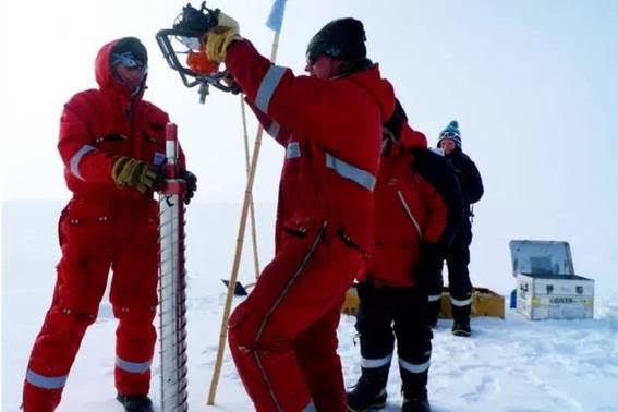 Legenda: Cientistas perfurando amostras de gelo na Antártida para ver até onde a contaminação por PFAS chegou - Markus Frey