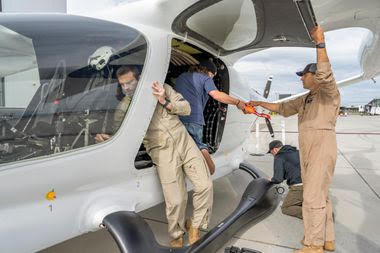 Profissionais da Beta Technologies preparam aeronave para voo experimental; 'É difícil não querer fazer parte disso', diz o piloto Chris Caputo (à direita). Foto Tony Cenicola-The New York Times