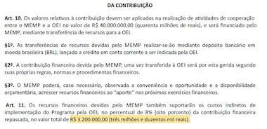 Trecho do acordo entre o Memp e a OEI: entidade pode embolsar até R$ 3,2 milhões. Foto Memp Reprodução