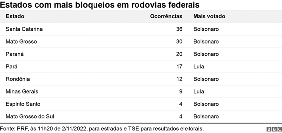 Um dado no levantamento da PRF chama atenção: os locais com maior número de bloqueios em rodovias federais são atualmente Santa Catarina (com 36 pontos de bloqueio), Mato Grosso (30) e Paraná (20), Estados que deram maioria dos votos a Bolsonaro na eleição e que são potências do agronegócio nacional.