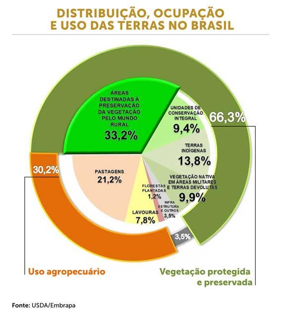 Essa posição vem acompanhada da liderança em preservação. Dois terços de todo o território estão preservados. Em média, as áreas de conservação brasileiras cobrem por volta de 50% das áreas agrícolas. Em média, os produtores rurais brasileiros preservam 50% de sua propriedade — a porcentagem, determinada por lei, varia de acordo com o Estado: em São Paulo, por exemplo, são 20%; na Amazônia, 80%. Isso não ocorre em nenhum outro lugar do planeta.