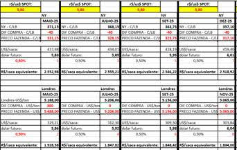 Após negociar na quarta-feira na máxima da semana (@ 393,70 centavos de dólar por libra-peso) o “banho de sangue” veio na sexta-feira. O vencimento maio-25 encerrou @ 365,70 centavos de dólar por libra-peso – nos últimos 3 pregões o maio-25 caiu -2.800 pontos (ou 37 US$/saca) – fechamento anterior / mínima / máxima / nova mínima / fechamento atual respectivamente @ 379,95 / 378,55 / 393,70 / 364,90 / 365,70 centavos de dólar por libra-peso.