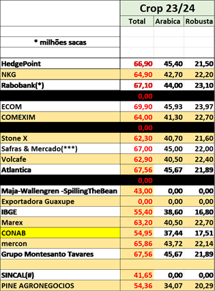 E a Mercon está estimando a safra 23/24 em +65,86 milhões de sacas sendo +43,72 milhões de sacas do tipo arábica e +22,14 milhões de sacas do tipo robusta.