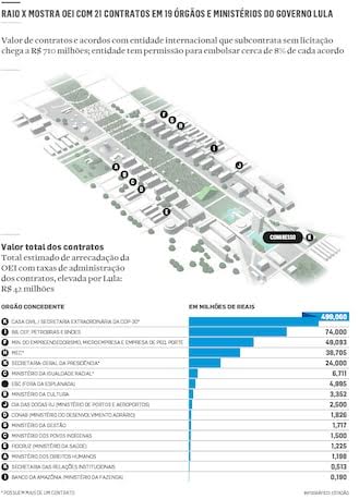No principal contrato firmado com o governo, a OEI foi escolhida para gerir R$ 480 milhões destinados à realização da COP-30, em Belém. De acordo com informações do edital, a entidade será responsável pela contratação de profissionais de limpeza, recepcionistas, tradutores e motoristas.