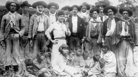 Em pe, bugreiros (milicianos contratados para dizimar indigenas) posam com mulheres e crianças do povo Xokleng capturadas apos ataque a acampamento. Foto acervo SCS