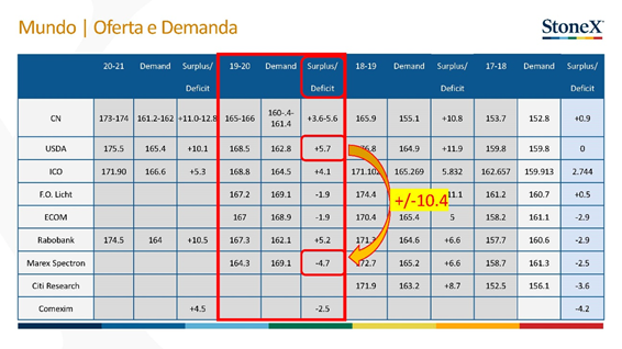 O palestrante criticou a forma como as estatísticas de oferta e demanda da cadeia café é realizada, ressaltando que nos 29 anos de carreira, trabalhando com o produto, nunca conseguiu números confiáveis. “Com os dados disponíveis hoje é praticamente impossível saber o real volume de café produzido, consumido e em estoque no mundo”. Scalla apresentou uma planilha (vide imagem abaixo) de oferta e demanda que mostra uma diferença de mais de 10,4 milhões de sacas. Disse ainda que cerca de 30 empresas fazem pesquisa de produção brasileira sem visitar o Brasil. “Isso traz volatilidade”. Continuou dizendo que “o mercado não pode receber essa falta de transparência por parte do mundo cafeeiro”.