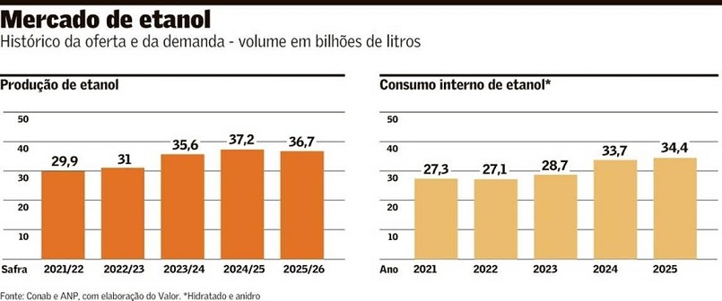 No ano passado, quando o consumo do ciclo Otto (gasolina e etanol) foi recorde, as vendas totais de etanol — somando o hidratado vendido nos postos e o anidro misturado à gasolina — alcançaram cerca de 34 bilhões de litros. Em 2026, o consumo do ciclo Otto deve ter um aumento na faixa entre 1,6 bilhão e 1,9 bilhão de litros em gasolina equivalente, segundo estimativa recente da consultoria Datagro. Se todo esse acréscimo for garantido pelo etanol hidratado, trata-se de um consumo adicional de 2,3 bilhões de litros.
