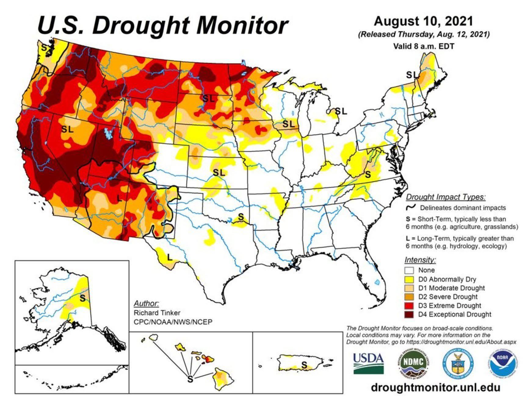 O Monitor de Secas dos EUA, que analisa e atualiza a situação a cada semana, tem mostrado todas as áreas a oeste das Montanhas Rochosas e os estados de Dakota do Norte e do Sul e Minnesota em alguma categoria de seca desde meados de 2020, e que vem tendo um impacto nas atuais colheitas. Embora a maioria das safras anuais seja plantada na primavera, há um grupo seleto de cultivos — incluindo um tipo de trigo — que são plantados no outono, ficam dormentes no inverno e surgem na primavera. Culturas como essa podem tirar proveito de um inverno mais úmido ou início da primavera e podem enfrentar climas mais adversos no verão que prejudicariam sua produtividade. No entanto, devido à seca do ano passado, o plantio de outono não ofereceu o melhor começo para muitos produtores de trigo, já que as condições de seca dificultaram o desenvolvimento de um bom sistema radicular das plantas jovens antes de adormecerem durante o inverno. O plantio de trigo na primavera não está se saindo melhor, já que a seca contínua durante a primavera e o verão está causando problemas.