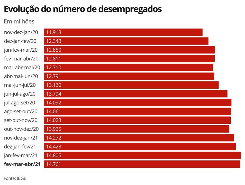 - Entre janeiro e abril, cerca de 500 mil brasileiros ficaram desempregados; na comparação com abril de 2020, são quase 2 milhões a mais de desempregados no país;