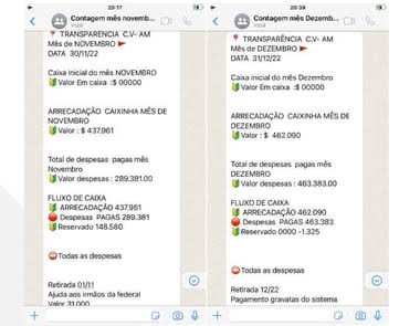 Os dados do aparelho mostram a existência de uma contabilidade detalhada por parte da facção, com o registro de ingressos e despesas, inclusive para a compra de armas e de pagamentos para a “matriz” do Comando Vermelho no Rio de Janeiro. As tabelas são intituladas “Transparência C.V-AM”. Em outubro de 2022, por exemplo, a arrecadação foi de R$ 434,3 mil.
