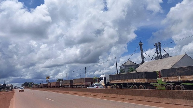 Sem conseguir depositar a soja nas estações de descarga, os caminhões estacionam no posto de apoio da rede Mirian, em Candeias do Jamari (RO). Na tarde de ontem (17), já havia carretas estacionadas à beira da rodovia porque o pátio do posto de apoio estava lotado, segundo informações enviadas por produtores rondonienses.