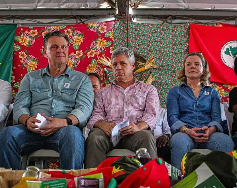 Carlos Fávaro (Agricultura), Paulo Teixeira (Desenvolvimento Agrário e Agricultura Familiar) e Gleisi Hoffmann, presidenta do PT, que fala pelos cotovelos, em evento do MST – Divulgação - MST