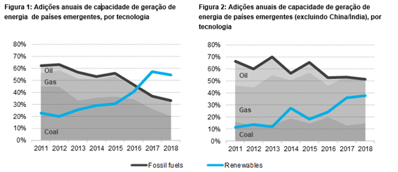 - Em 2018, países em desenvolvimento adicionaram 201GW de nova capacidade de geração de energia às suas redes elétricas, com energia limpa (excluindo grandes hidrelétricas) representando pouco mais do que metade. Um total de 107GW de energias renováveis foram instaladas em economias emergentes em 2018.