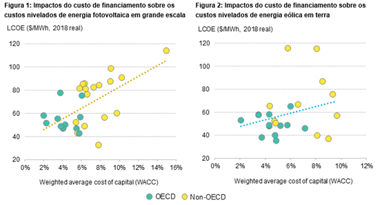 - A competitividade de custos de energias renováveis nos países em desenvolvimento, historicamente, foi dificultada pelo aumento do custode capital doméstico. Como os projetos de energias renováveis necessitam de muito capital, o custo de financiamento disponível para os desenvolvedores destes projetos resultou na segregação entre países ricos e países menos desenvolvidos. Em países da OCDE, o custo médio ponderado de capital (WACC) que a BloombergNEF (BNEF) tem monitorado para projetos de energia eólica e fotovoltica em 2017-2018 oscilou entre 2,0 e 7,1%. Nos países emergentes, o benchmark oscilou entre 4,4 e 15%.