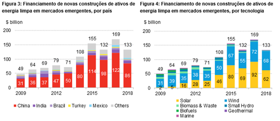 - Em 2018, novos investimentos de energia limpa para os mercados emergentes totalizaram US$133 bilhões, uma redução em relação aos $169 bilhões alcançados em 2017. A China foi responsável por mais de dois terços do total dos mercados emergentes e também foi amplamente responsável pelo declínio entre 2017 e 2018. No total, US$36 bilhões a menos foram para o setor de energia limpa na China, em relação a 2017.