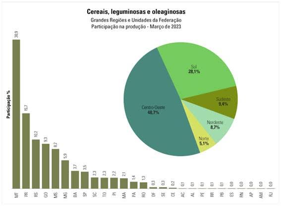 Mato Grosso lidera como o maior produtor nacional de grãos, com participação de 30,9%, seguido pelo Paraná (15,7%), Rio Grande do Sul (10,2%), Goiás (9,3%), Mato Grosso do Sul (8,2%) e Minas Gerais (5,9%), que, somados, representaram 80,2% do total.