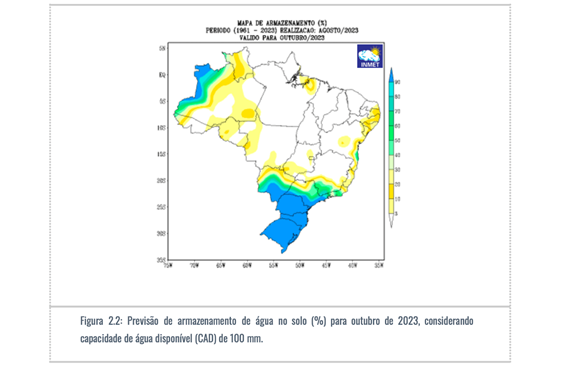 O prognóstico climático aponta para o retorno gradual da chuva na porção sul das regiões Centro-Oeste e Sudeste, principalmente em novembro, fator importante para a elevação do armazenamento de água no solo e o estabelecimento das fases iniciais das culturas no campo, como a soja, milho e algodão. Entretanto, na porção norte das regiões Centro-Oeste e Sudeste, a irregularidade das chuvas, combinada com altas temperaturas, pode reduzir os níveis de água no solo.
