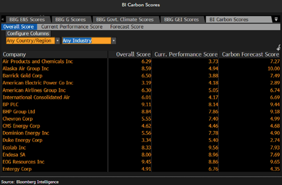 Nosso portfólio de líderes inclui as empresas com os maiores scores de carbono BI no quartil superior e as retardatárias na parte inferior.