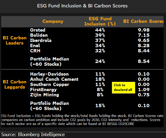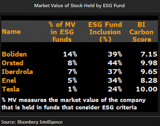 As empresas do maior quartil de scores de carbono BI têm mais chances de atrair capital de investidores ESG e de se beneficiar de mais investimentos futuros, conforme estes fundos crescem. Dentre as empresas menores que lideram o score, como a mineradora Boliden, os fundos ESG respondem por pelo menos 14% do seu valor de mercado — indicando não só o potencial de atrair mais fundos como também de atrair mais riscos, caso falhe em questões ESG ou diminua o fluxo para tais fundos. Para ações maiores, como a Tesla, a trajetória dos investimentos em ESG terá pouco impacto, pois esses fundos respondem por apenas 1% do valor de mercado.