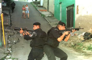 Policiais militares na Favela de Nova Brasília, no Rio de Janeiro, na operação que procurava o corpo do jornalista Tim Lopes, assassinado dentro da comunidade em 2002. Foto Wilton Junior-AE