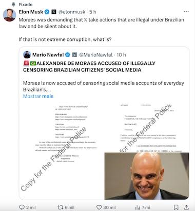 Elon Musk insinua que Moraes cometeu "extrema corrupção" Foto @ElonMusk via X