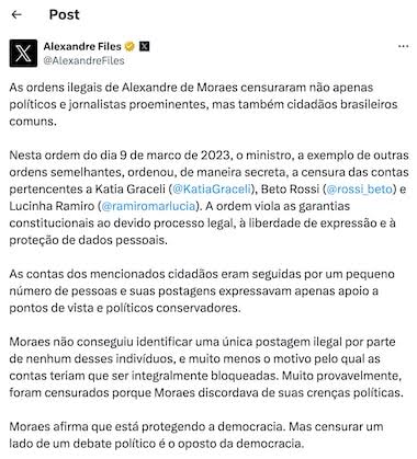 “As ordens ilegais de Alexandre de Moraes censuraram não apenas políticos e jornalistas proeminentes, mas também cidadãos brasileiros comuns. Nesta ordem do dia 9 de março de 2023, o ministro, a exemplo de outras ordens semelhantes, ordenou, de maneira secreta, a censura das contas pertencentes a Katia Graceli (@KatiaGraceli), Beto Rossi (@rossi_beto) e Lucinha Ramiro (@ramiromarlucia). A ordem viola as garantias constitucionais ao devido processo legal, à liberdade de expressão e à proteção de dados pessoais. As contas dos mencionados cidadãos eram seguidas por um pequeno número de pessoas e suas postagens expressavam apenas apoio a pontos de vista e políticos conservadores”, escreveu na postagem do perfil Alexandre Files.