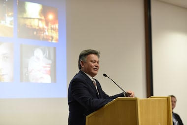 O promotor Lincoln Gakiya mostrou os dados sobre a entrada do PCC no mercado asiático do tráfico de drogas e a lavagem de dinheiro no Brasil. Foto: Alex Sandro/USP