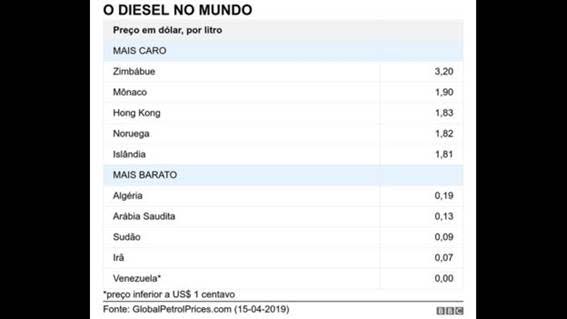 No ranking internacional do diesel, 57 países têm o produto a preços menores que o do Brasil e 105 têm o preço mais alto, na comparação dos preços convertidos em dólar. Ou seja, o Brasil fica em 106º lugar no ranking de 163 países com diesel mais caro no mundo.