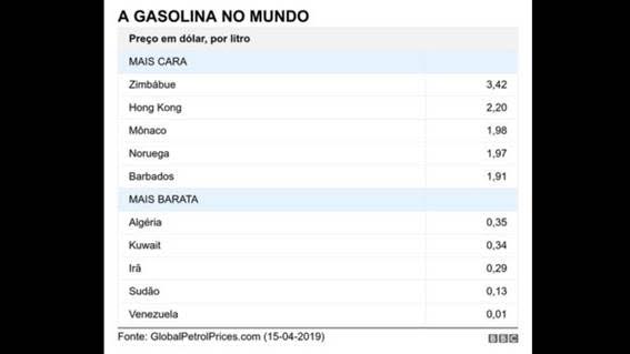 Nos dois casos, Venezuela, Sudão e Irã estão entre os locais com combustíveis mais baratos e Zimbábue, Hong Honk e Mônaco registraram os preços mais altos. Os dados são do site Global Petrol Prices, usado como referência pela Petrobras.