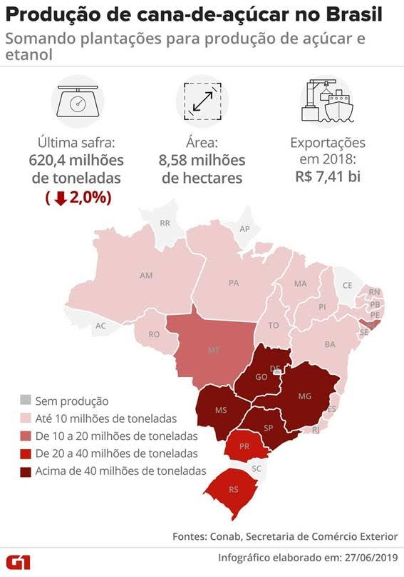 A produção de cana-de-açúcar no Brasil na safra 2019/20 já começou e a colheita prevista para o início do ano que vem é de 615 milhões de toneladas, 0,7% menos que no último ciclo, segundo o último levantamento da Conab.