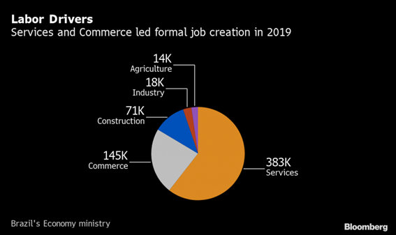 Setores intensivos em mão de obra, que se beneficiam dos juros em mínimas históricas – como construção, varejo e serviços -, podem registrar o segundo ano seguido de forte criação de empregos em 2020. As baixas taxas de juros também alimentam o otimismo em relação à economia, que, por sua vez, ajuda a diminuir o desemprego, segundo Adriana Dupita, economista para a América Latina da Bloomberg Economics.
