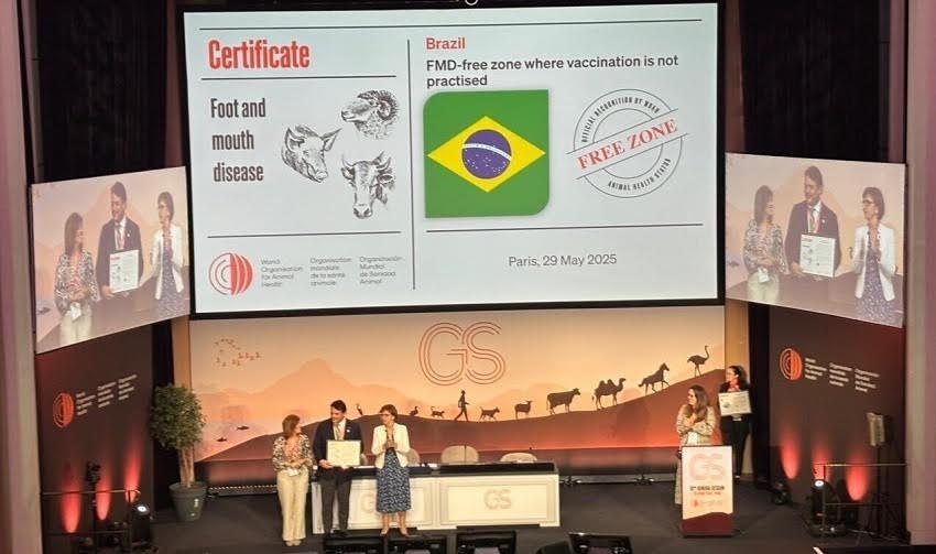 O Brasil já havia se autodeclarado livre da febre aftosa sem vacinação no início de 2024, mas o reconhecimento oficial internacional era aguardado para consolidar o novo status sanitário. A certificação deve ampliar o acesso do país a mercados exigentes, como Japão, Coreia do Sul e Estados Unidos, e elevar o valor agregado das exportações de carne bovina (Poder 360, 29/5/25)