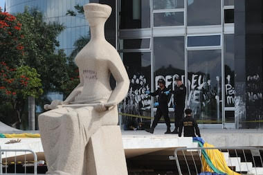 Fachada do Supremo Tribunal Federal (STF), com destaque para a estátua da Justiça com a pichação "perdeu mané". Foto Wilton Junior