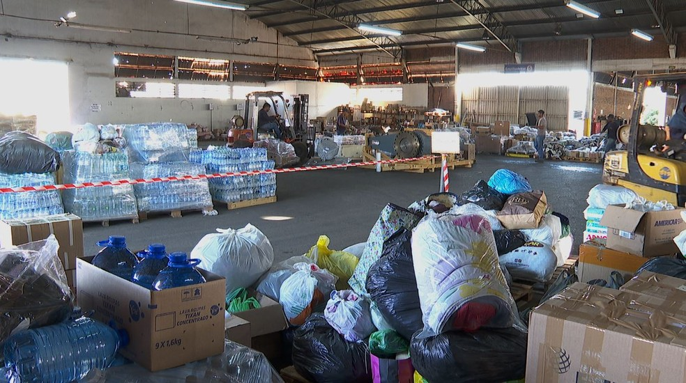Armazéns foram improvisados em Ribeirão Preto para receber as doações para que já foram transportadas em 13 carretas com destino ano Sul. A última saiu na manhã desta 3ª feira. Foto Reprodução EPTV