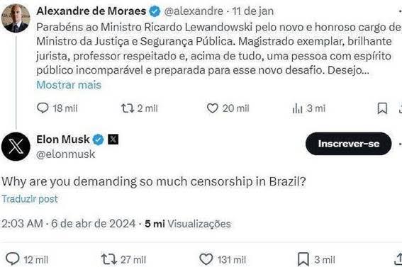 Elon Musk questiona Alexandre de Moraes em postagem no último sábado (6) - Reprodução