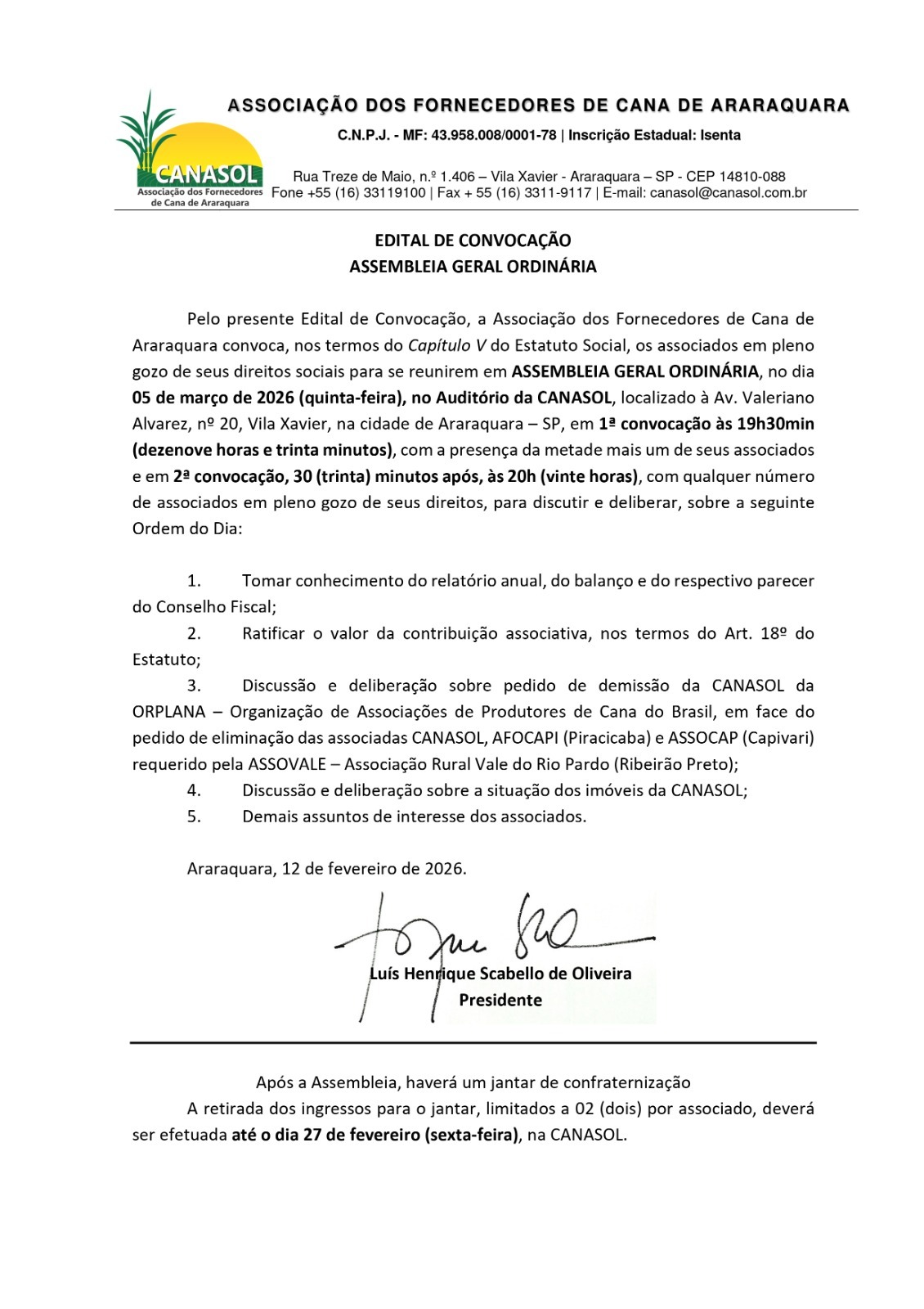 Produtores associados da Canasol afirmam que o presidente Luis Henrique Scabello de Oliveira tomou sozinho a decisão de se integrar às associações de Piracicaba e Capivari sem consultar os associados da região de Piracicaba. “A impressão que temos – afirma um dos associados – é que ele convocou esta assembleia para amanhã (5) com o único objetivo de tentar regularizar a ilegalidade que cometeu. Estamos atentos e, se necessário, podemos instar a Justiça para que nossos direitos sejam preservados”, afirma (Da Redação, 5/3/26)