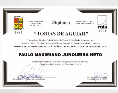 Coube ao Cel. Mello Araujo, vice-prefeito de São Paulo e ex-comandante da Rota, a honraria de entregar o diploma a Paulo Junqueira