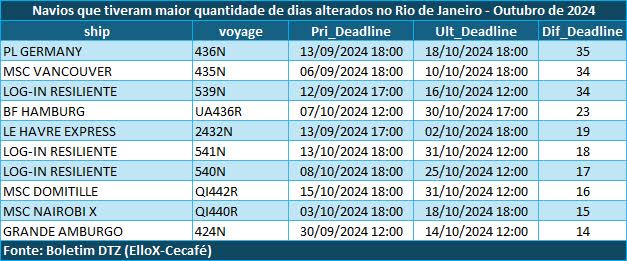Ainda em outubro deste ano, 20% dos procedimentos de exportação tiveram prazo superior a quatro dias de gate aberto por porta-contêineres nos portos fluminenses; 27% registraram entre três e quatro dias; e 53% possuíram menos de dois dias.