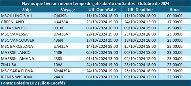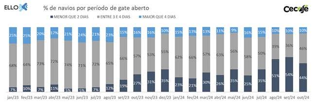 Ainda no mês passado, apenas 10% dos procedimentos de embarque tiveram prazo maior do que quatro dias de gate aberto por navios no embarcadouro santista. Outros 46% possuíram entre três e quatro dias e 44% tiveram menos de dois dias.