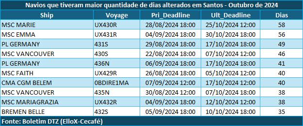 De acordo com os dados do Boletim DTZ, em outubro, o Porto de Santos, ainda o principal terminal escoador dos cafés brasileiros ao exterior, com 67,4% de participação, registrou um índice de 74% de atraso ou alteração de escalas de navios, o que envolveu 125 do total de 169 embarcações.