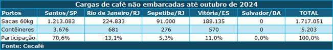 Os exportadores brasileiros de café seguem enfrentando intensos gargalos logísticos neste ano devido à falta de infraestrutura adequada para cargas conteinerizadas nos portos do Brasil. Em 2024, os múltiplos atrasos e alterações constantes de escala de navios para exportação, além de frequentes rolagens de cargas, fizeram com que o país acumulasse 1,717 milhão de sacas – 5.203 contêineres – do produto não embarcadas até outubro. Os dados são de levantamento do Conselho dos Exportadores de Café do Brasil (Cecafé) junto a exportadores associados.