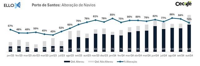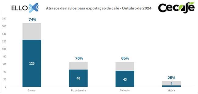 Segundo o Boletim Detention Zero (DTZ), elaborado pela startup ElloX Digital em parceria com o Cecafé, 69% dos navios, ou 218 de um total de 317 porta-contêineres, tiveram atrasos ou alteração de escalas para exportar café, nos principais portos do Brasil, em outubro deste ano.