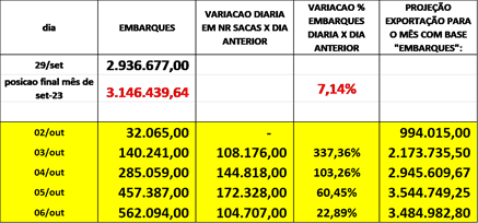 Então, com base nos últimos dados publicados no dia 29/09 pela Cecafé*, considerando que ainda teríamos + 2 dias para fechar os números do mês de set-23 (setembro tem 30 dias), então a exportação para o mês de set-23 poderá ficar ao redor das +3,15/+3,25 milhões de sacas.
