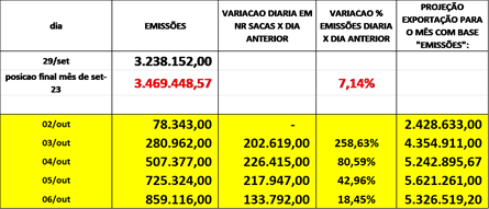 Para o mês de outubro-23, com base nos dados publicados pela Cecafé* na primeira semana de out-23, notem como a variação e “projeção” dos números diários com base nas “emissões e embarques” oscilam: