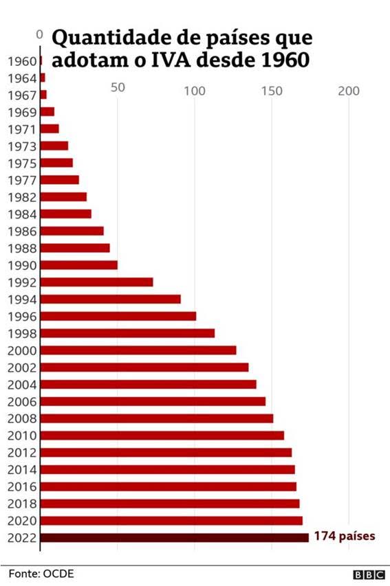 Hoje, o maior IVA do mundo é o da Hungria (27%). Os países da Organização para Cooperação e Desenvolvimento Econômico (OCDE) têm alíquota média de 19,2%. Dos 38 integrantes da organização, formada principalmente por países ricos, apenas os Estados Unidos não adotam o IVA.