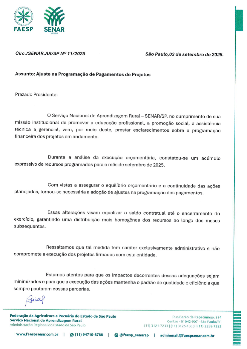 Através da Circular/Senar/AR/SP Nº 11/2025, de 3 de setembro de 2025, assinada pelo superintendente do Senar/SP Márcio Antonio de Moraes Biral, os presidentes dos sindicatos rurais que compõem a Federação da Agricultura do Estado de São Paulo – Faesp/Senar, foram notificados de que “Durante a análise da execução orçamentária constatou-se um acúmulo expressivo de recursos programados para o mês de setembro de 2025”.